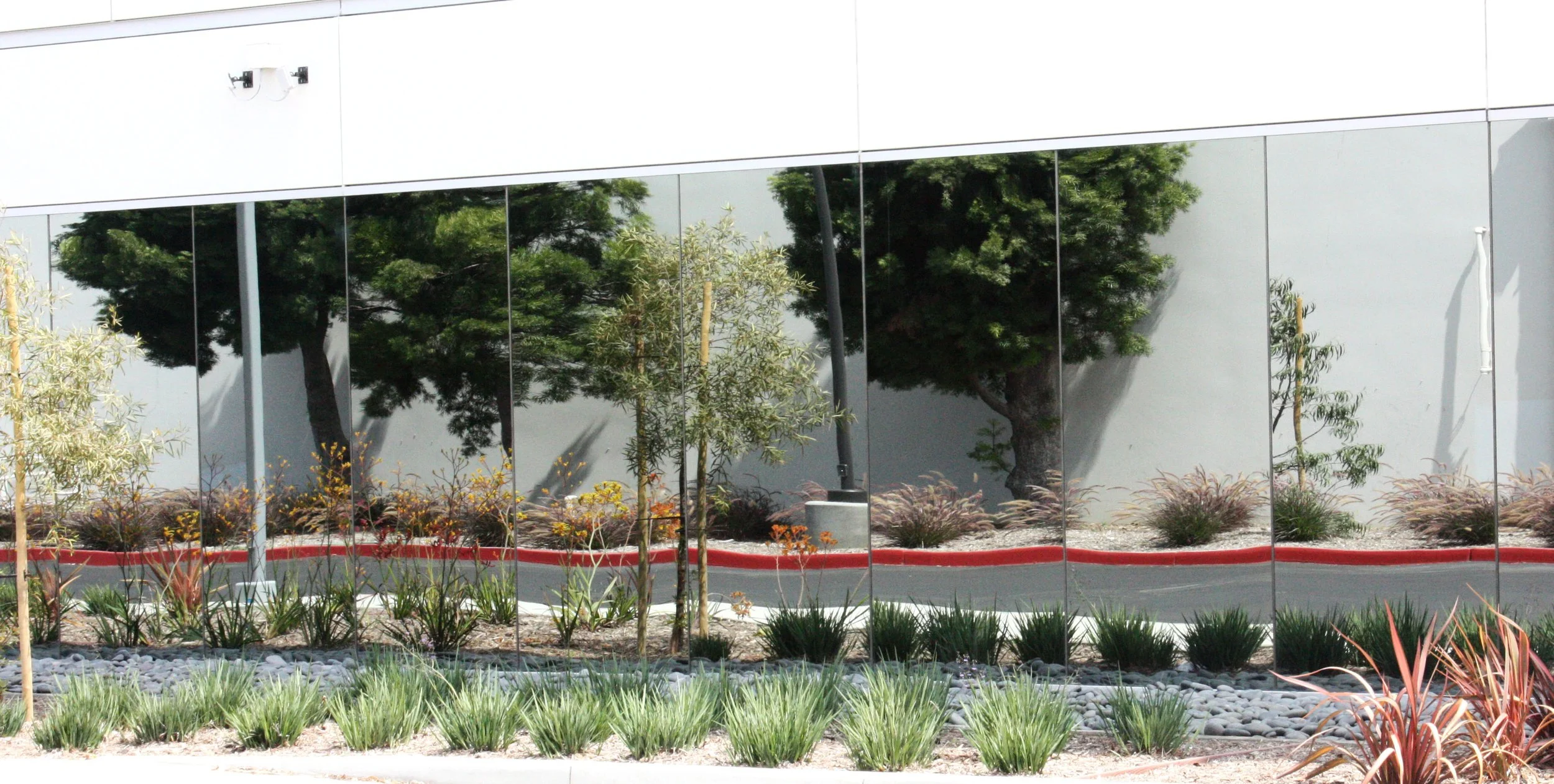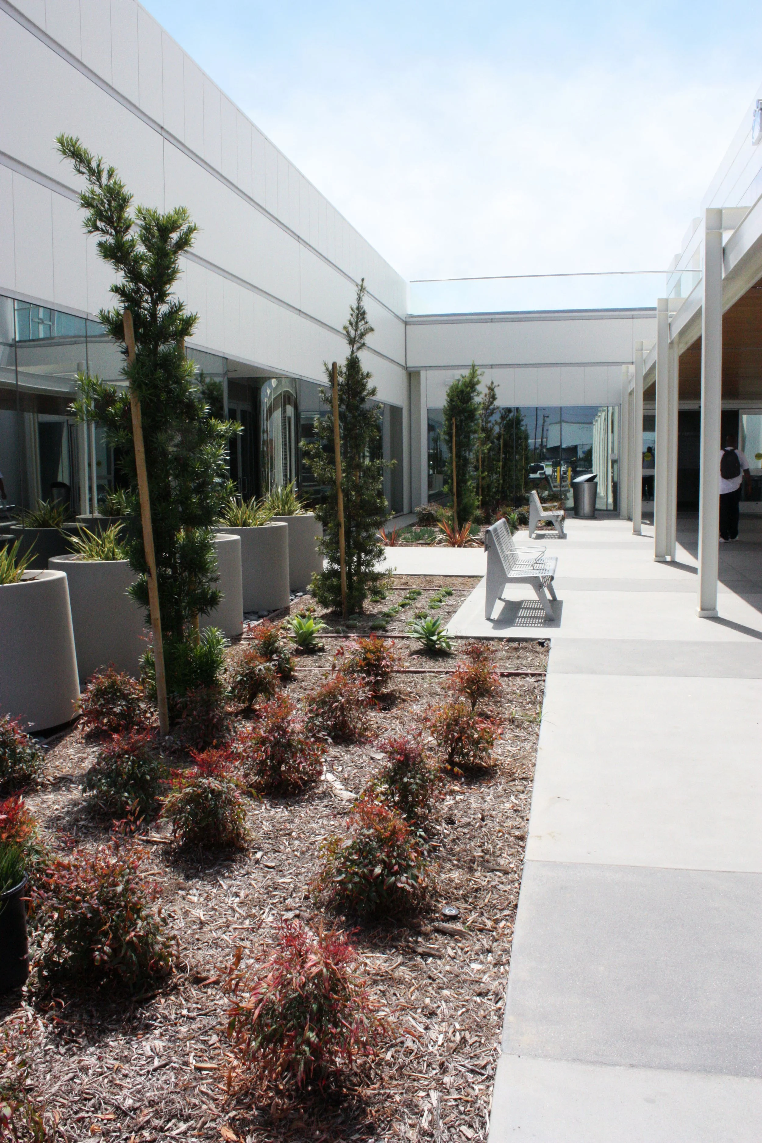 The overall planting design and the planting materials chosen created an opportunity to utilize water conservation principle to achieve sustainability. Drought tolerant and locally adapted tree species are strategically located as a way finding element to direct users and visitors around the facility. Flowering shrubs and colourful succulents are used around the building in repeating geometric banding to complement the architecture and to provide colour accent. Expanding on the existing design, continuous bandings of Mexican Beach Pebble were used around the building perimeter for aesthetics and to keep irrigation water away from the building and windows.