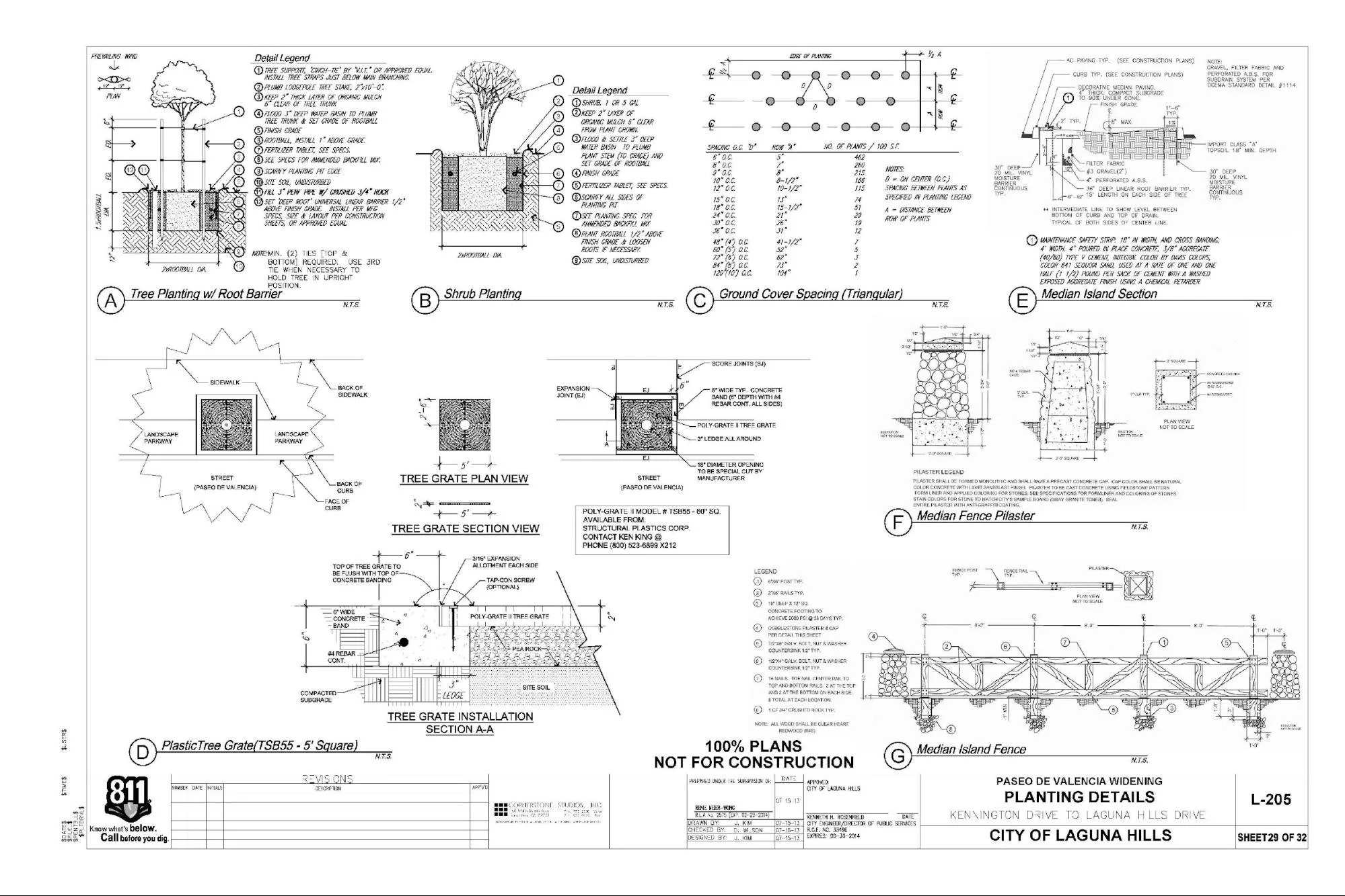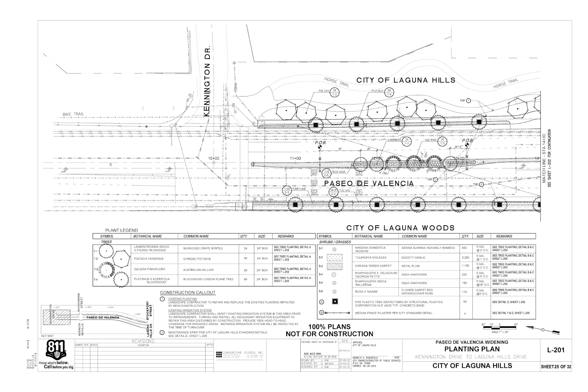 Cornerstone Studios, Inc. provided streetscape improvements for Paseo de Valencia between Kennington Drive and Laguna Hills Drive/Stockport Street that involved the street widening and realignment to accommodate a dedicated bike path. Our scope included the inventory of existing trees, landscape design of the raised median as well as the parkway with recycled tree grates, and locating the City monument signs. Our landscape design conveys a dynamic and colorful streetscape while demonstrating drought tolerant and low maintenance principles.